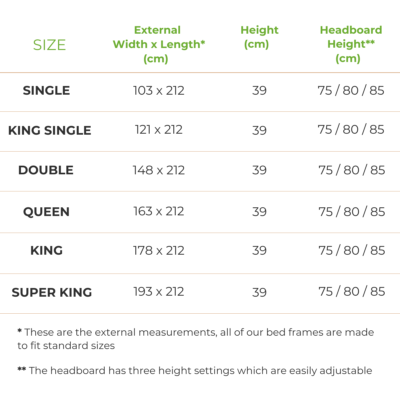The solid wood headboard is height adjustable. The frame is easily assembled from flat-packed with strong slot-together steel fasteners.