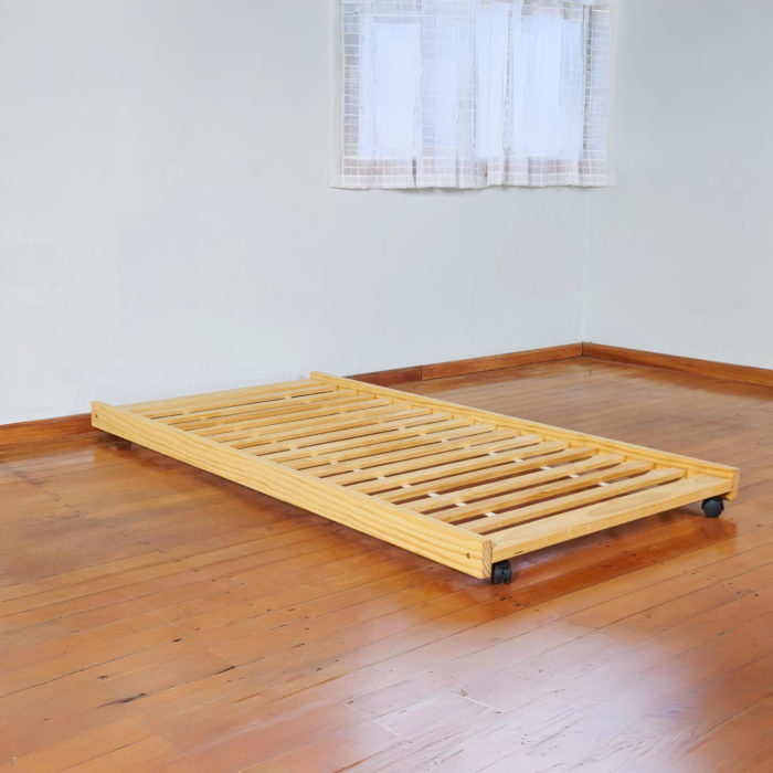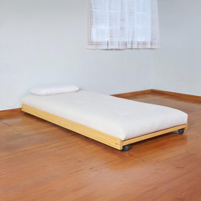 The Trundler Base easily rolls out from underneath your bed, and you simply lock the wheels to put it in place. The solid pine slats ensure good circulation for the mattress, and you can put either a mattress or a futon onto the base.